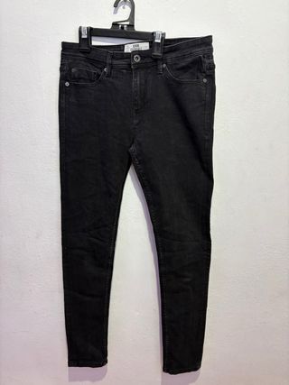 Pantalones vaqueros ajustados de Zara con un diseño moderno y desgastado. Talla 42 eu - Estilo skinny. - Acabado negro con rotos y detalles. - Inscripciones decorativas en las perneras.