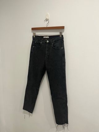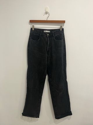 Pantalón vaquero de Zara en color negro con un diseño desgastado y roto. - Corte moderno. - Detalles rasgados. - Cintura con botón y cremallera.