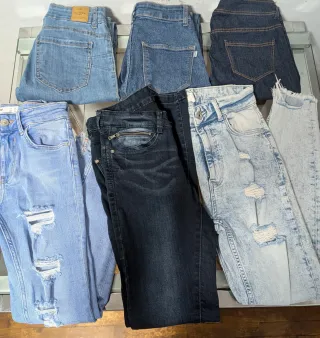 Conjunto de seis pantalones vaqueros de la marca Bershka. - Talla 34. - Variedad de tonos azules. Todos en perfecto estado. Algunos incluso solo puestos un pequeños rato Posibilidad de vender sueltos