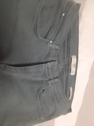 Pantalón vaquero de color verde, estilo pitillo. - Cintura alta. - Bolsillos delanteros y traseros. - Cierre de cremallera y botón. - Bajo con abertura lateral.