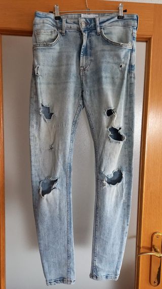 Pantalón vaquero estilo skinny con un diseño moderno y desgastado. - Corte ajustado. - Efecto desgastado y roto en rodillas y bajos. - Lavado azul clásico. NO ENVÍOS, entrega en mano.
