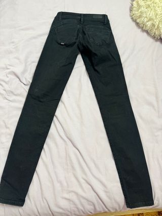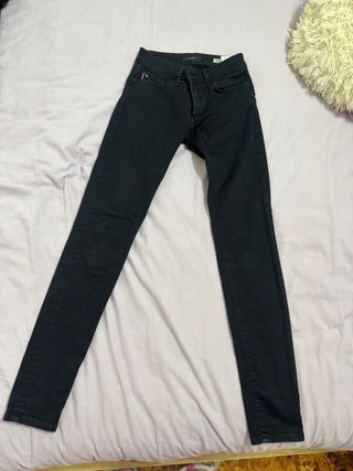 Pantalones vaqueros de la marca Calvin Klein Jeans en color gris oscuro / negro lavado. Corte Skinny (ajustado) que estiliza mucho. • Talla: 27 (equivale a una 36 o 38 pequeña, ver medidas). • Estado: Muy buen estado, poco uso. El tejido mantiene bien su elasticidad. • Detalle: Etiqueta original visible en las fotos. • Estilo: Básico atemporal, perfecto para combinar con todo.