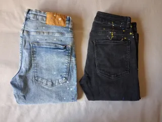 Pantalones vaqueros con un diseño moderno y llamativo. - Estilo con salpicaduras de pintura. - Dos pares incluidos, uno en azul y otro en negro.