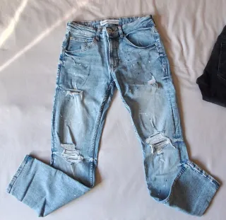 Pantalon vaqueros de Bershka con un diseño moderno y desgastado. Puestos una sola vez tengo varios mirar mi perfil costaron 46 euros en el bershka porque se me han pasado de talla. GRAN OPORTUNIDAD. - Estilo desgastado con rotos. - Efecto salpicaduras de pintura. - Lavado azul claro.