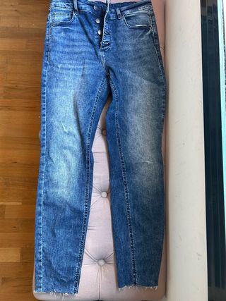 Vaqueros largos de corte recto con un estilo moderno y desgastado en los bajos. - Diseño de tiro alto. - Cierre de botones. - Tejido vaquero resistente. - Talla 34 de pantalón (ES) Mujer 💵Solo se admite pago en efectivo💵