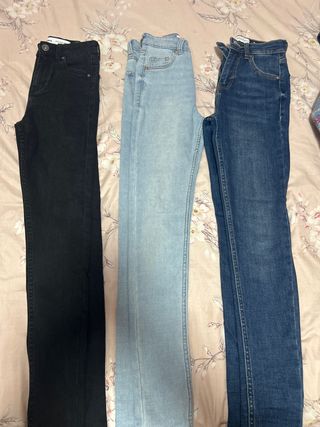 Tres pares de pantalones vaqueros de la marca Bershka. - Un par de color negro. - Dos pares de color azul en diferentes tonos. - Talla 32. el precio es por los tres cada uno 12€ sin estrenar