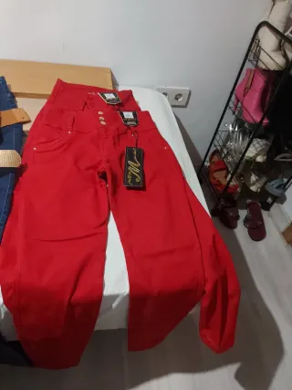 Pantalones vaqueros de color rojo. -Muy cómodos - Cierre de botón y cremallera.