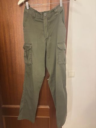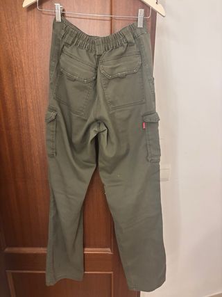 Pantalones de estilo cargo en color verde. Tiene un elástico en la cintura y hace muy buena figura. - Bolsillos laterales. - Cierre de botón y cremallera. - Cintura con trabillas.
