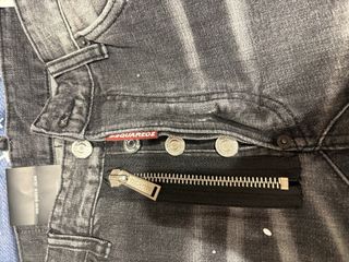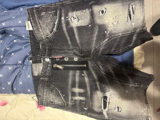 Pantalones vaqueros con un diseño moderno y desgastado. - Acabado en negro con detalles de pintura blanca. - Efecto desgastado y rotos. - Cremallera frontal.
