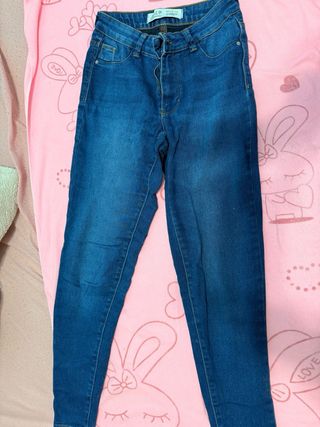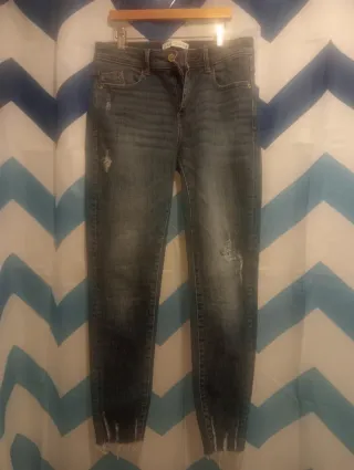 Pantalones vaqueros de corte skinny de la marca Pull & Bear. - Lavado estilo acid wash o desteñido. - Tiro medio. - Cierre de cremallera y botón. tienen el bajo metido ,de largo miden 98,5 cm. además la etiqueta trasera se rompió.adjunto fotos