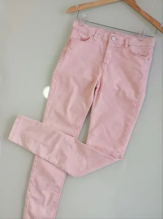 Pantalón pitillo corte vaquero cinco bolsillos, en color rosa aguado. Marca Stradivarius en talla 36.