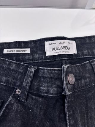 Pantalón vaquero con bolsillos delanteros y traseros, apertura mediante cremallera y botón. Talla 38. Marca Pull&Bear. Pequeña abertura en la parte posterior como figura en las imágenes. Medidas: - Largo: 97 cm - Cintura: 38 cm - Pata: 13 cm Posibilidad de envío.
