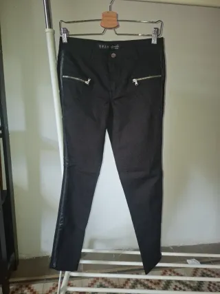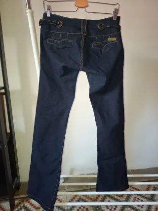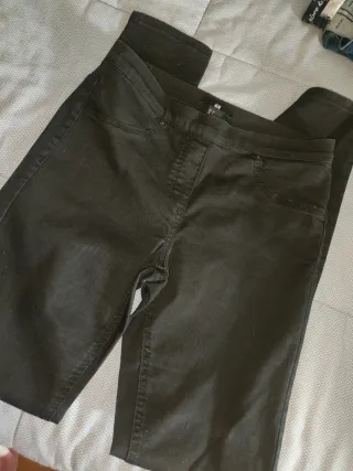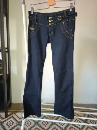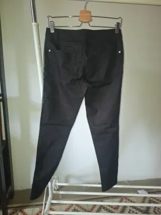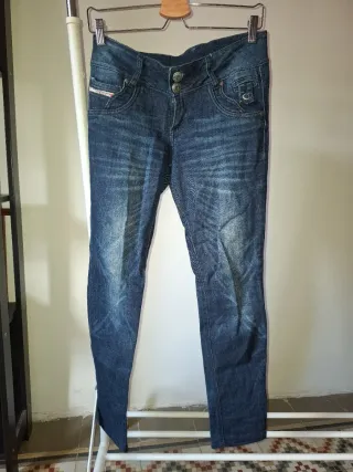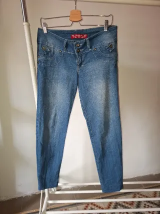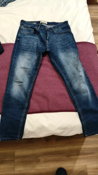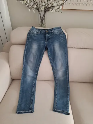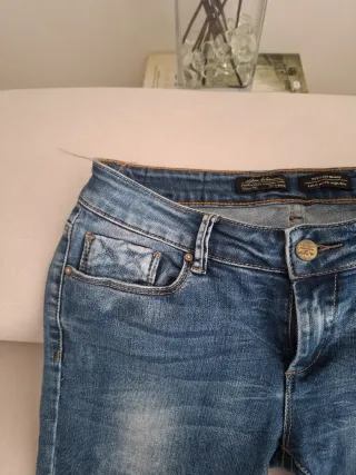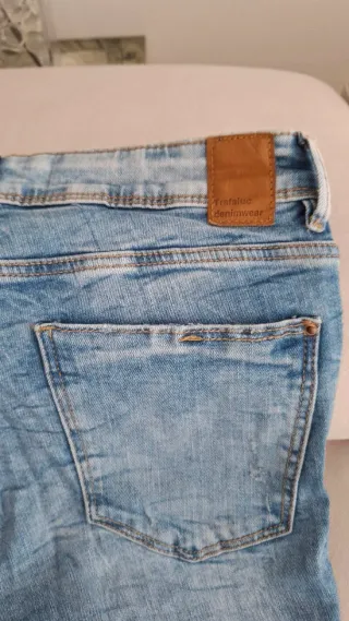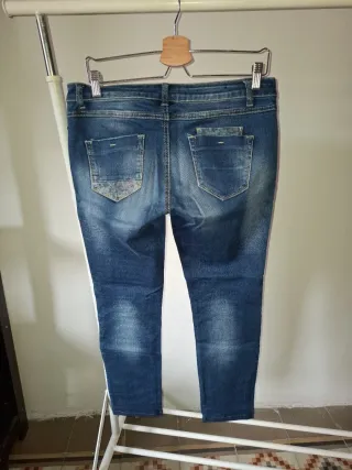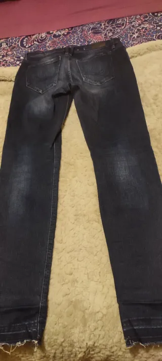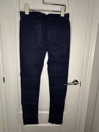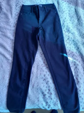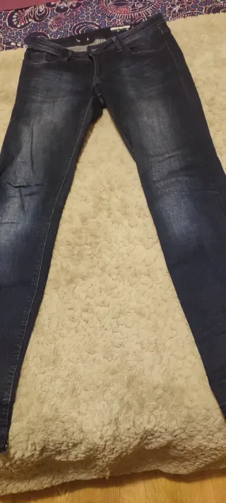 Pantalón vaquero largo de corte ajustado. - Diseño moderno y versátil. - Tejido denim de calidad. No pone talla pero equivale a una S, ya que yo soy una 38-40 y ya no le vale, le tengo desde hace años y era muy cómodo pero dejó de valerme y lleva tiempo guardado sin usarse, yo no le di mucho uso a pesar de lo cómodo que era. El único defecto que tiene es el desgaste de la etiqueta de atrás debido al tiempo (hay foto). Acepto negociar el precio