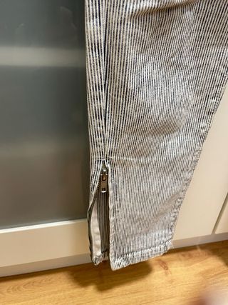 Pantalón vaquero de Stradivarius con un diseño de rayas verticales. Presenta un corte moderno y detalles desgastados. - Diseño a rayas. - Aberturas con cremallera en los bajos. - Efecto desgastado y rotos.