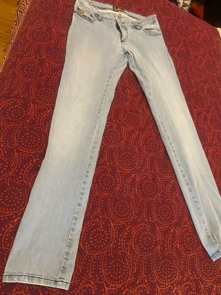 Pantalón vaquero de corte ajustado en tono azul claro. Presenta un diseño desgastado que le da un toque moderno. - Tiro medio. - Bolsillos delanteros y traseros. - Cierre de cremallera y botón. Aunque pone talla M es un 36. Talla pequeño