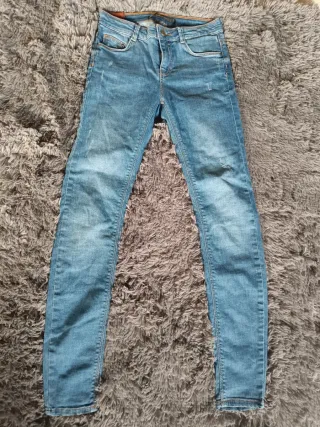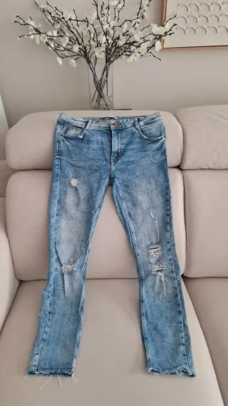 Pantalón vaquero de Zara en color azul. Diseño moderno y cómodo. Talla 40 pero sirve para 38 también - Corte ajustado. - Bajo deshilachado. - Bolsillos delanteros y traseros. Envíos más rápidos por GLS