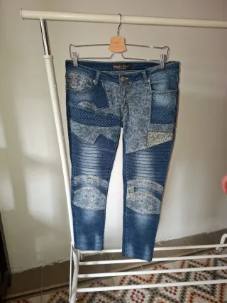Pantalón vaquero con un diseño original de patchwork y estampado floral. - Detalle de patchwork en toda la prenda. - Estampado floral integrado en el diseño. - Corte moderno y favorecedor.