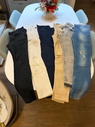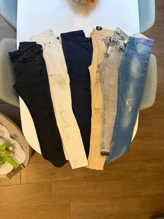 Talla 36 Pack de seis pantalones vaqueros de diferentes colores. Incluye un pantalón negro, uno blanco roto, uno azul marino, uno beige, uno gris claro y uno color vaquro - Pantalón negro. - Pantalón blanco con rotos. - Pantalón azul marino de vestir - Pantalón beige. - Pantalón gris claro con rotos. -Pantalon vaquero Se pueden vender por separado
