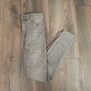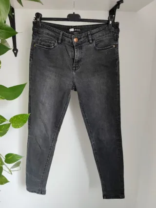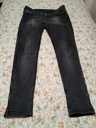 Pantalones vaqueros de corte skinny en color gris. Son cómodos y versátiles. - Cintura con trabillas. - Cierre de cremallera y botón. - Bolsillos delanteros y traseros. - Dobladillo en los bajos. Talla W34, parecida a Talla 42-44 Medidas en fotos