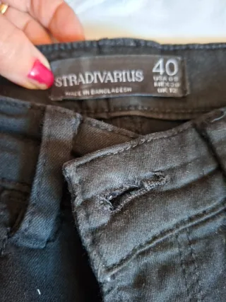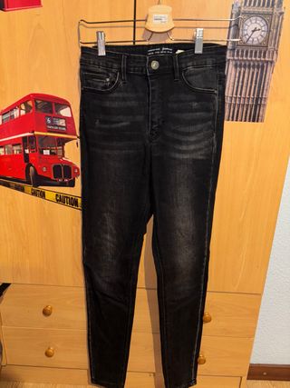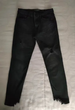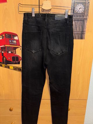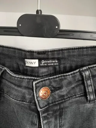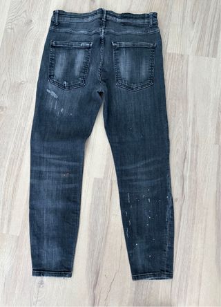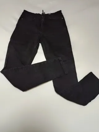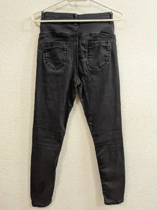 Pantalón vaquero de corte pitillo skinny en color negro con un ligero efecto desgastado. Marca Stradivarius. Con uso, pero aún le queda vida.