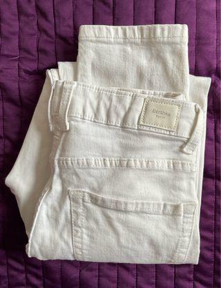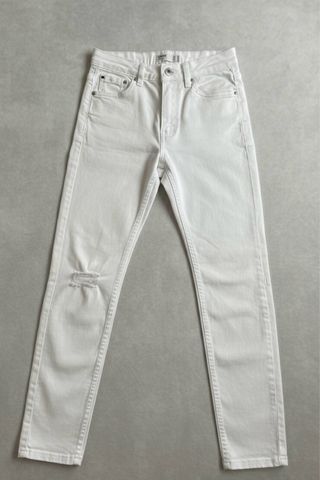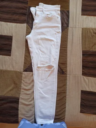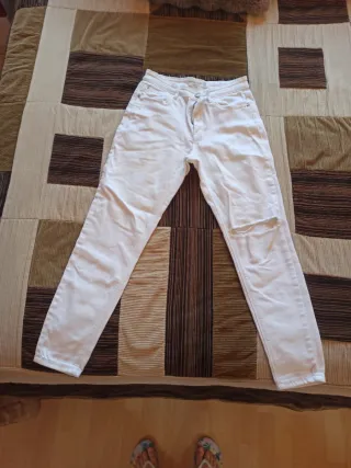 Denim de corte entallado con detalle de roto decorativo en la rodilla derecha. Estado: En muy buen estado general. Al ser una prenda blanca, podría presentar alguna marca mínima de almacenamiento casi imperceptible que desaparece con un lavado estándar, aunque a simple vista no se aprecia ningún defecto.