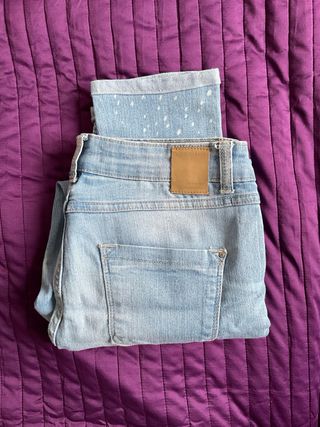 Pantalones vaqueros de Stradivarius. Su característica principal es el acabado con salpicaduras de pintura blanca en la parte inferior. Corte Skinny.