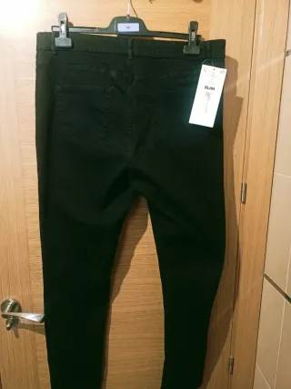 Vaquero negro de ZARA, totalmente nuevo y con etiqueta. Corte slim/recto muy favorecedor, color negro sólido y tejido elástico cómodo. Ideal para uso diario o looks más formales. Actualmente agotado en tiendas. Estado: Nuevo a estrenar Referencia: 8062/315/822 Color: Negro Talla: 38 EU (30 USA) MEDIAS APROXIMADAS: Ancho: 37cm Largo: 89.5cm (IMÁGENES GENERADAS POR IA)