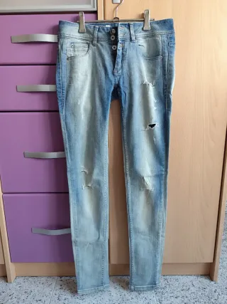 Pantalón vaquero mujer Pull&Bear tela gruesa detalles descosido y desgastado talla 36