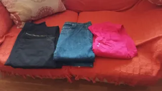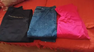 Conjunto de tres pantalones de premamá. - Pantalón negro con cremallera. - Pantalón vaquero azul. - Pantalón rosa.