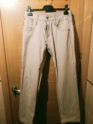Pantalón vaquero de hombre en color beige claro, ideal para un look casual y cómodo. Tiene varios bolsillos, cierre de botón y cremallera. Tela ligera y agradable al tacto, perfecto para el día a día. Está en buen estado, sin roturas ni manchas, solo con alguna marca de uso normal. Perfecto para combinar con cualquier estilo. hombre, ideal para el día a día. 📌 Diseño cómodo. 📌 Bolsillos frontales y traseros. 📌 Talla: 32