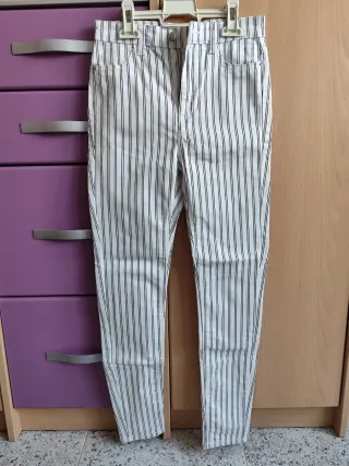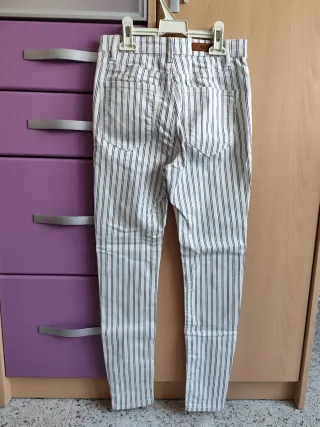 Pantalón vaquero de mujer de Stradivarius Blanco con rayas negras Super High Waist talla 36 ajustados, elásticos, cintura alta una sola puesta