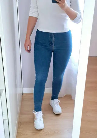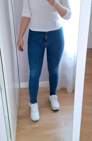 Pantalones vaqueros pitillo. Tiro alto. Talla: 36. Mirar medidas en última foto. Color azul Composición: 70% algodón, 28% poliéster, 2% elastano. Estado: perfecto. Precio: 7€