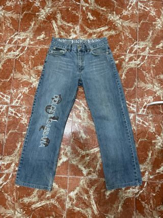 Pantalón vaquero de la marca Collectif con un diseño único. - Bordado Trouble Maker en hilo rojo. - Dos bolsillos traseros. - Corte de cintura alta. Medidas de cintura de lado a lado 40cm Medida del tiro 41 cm Largo de pierna a cintura 110cm Usado 2 veces