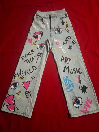 Pantalón vaquero original con un diseño único y llamativo. - Estampado Yeah! en la cintura. - Dibujos de ojos, labios y corazones. - Frases como Rock that world y Love and art music. - Detalles de rayos y estrellas.