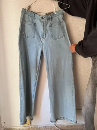 Pantalones vaqueros de Stradivarius con un lavado desgastado. - Corte ancho. - Tiro alto. - Diseño de cinco bolsillos. Solo puesto 1 vez