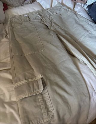 Pantalón largo estilo cargo de Zara en color beige. Presenta un diseño moderno y funcional. - Bolsillos cargo en los laterales. - Cintura con trabillas para cinturón. - Cierre de botón y cremallera.