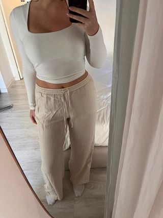 Pantalones de Zara para mujer. - Diseño de pierna ancha. - Cintura elástica. - Detalle de encaje en la parte superior de las perneras.