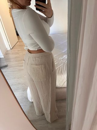 Pantalón de Zara en color beige. Diseño moderno y cómodo. - Cintura elástica. - Bolsillos laterales. - Tejido suave y resistente.