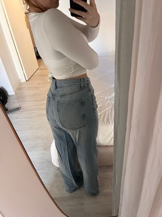 Tejanos de corte ancho de ZARA. Tiene los bajos hechos, pero se puede descocer fácil. Se usó para una sesión de fotos. - Diseño de pierna ancha. - Tono azul clásico.
