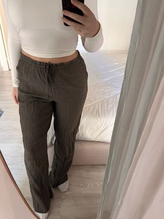 Pantalón estilo barrel de Zara en color verde oliva. Diseño moderno y cómodo. - Cierre de botones. - Bolsillos laterales.