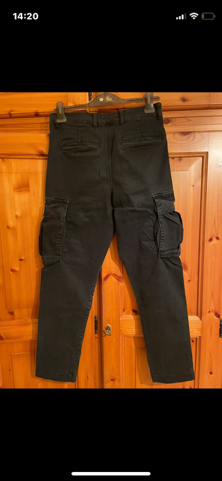 Pantalones cargo de Zara en color negro. Diseño moderno con múltiples bolsillos. - Bolsillos cargo en los laterales. - Cierre de botón y cremallera. - Corte recto.