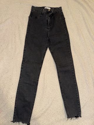 Pantalones vaqueros de color negro elásticos de tiro alto 31 cm. Ancho cintura 37 cm, largo pierna exterior 95 cm - Cierre de 4 botones plateados - Diseño de cinco bolsillos.