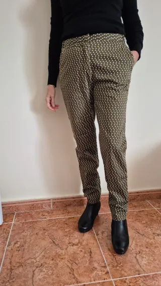 Pantalones tipo chino de Zara con un estampado geométrico en tonos verdes y blancos. - Corte recto. - Cintura con trabillas. - Cierre de cremallera y botón.