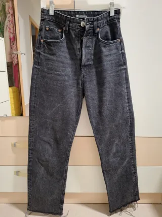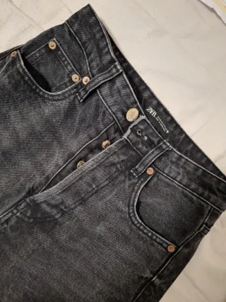 Pantalones vaqueros de Zara en color negro con efecto desgastado. Corte recto. En perfevto estado. Vendo porque me quedan pequeños. - Cintura alta. - Cierre de botones. - Bajo deshilachado.