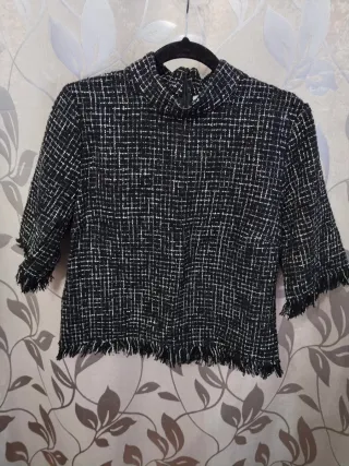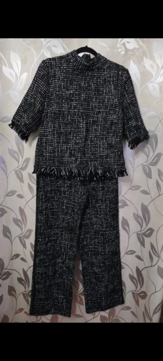 Elegante conjunto de dos piezas de Zara, perfecto para cualquier ocasión. Jersey con cuello alto y manga corta. El pantalón talla xs y el jersey talla m - Pantalón de corte recto. - Tejido tipo tweed con hilo plateado.