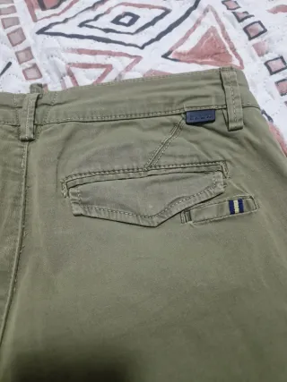 Pantalón de corte moderno en color verde oliva. - Dos bolsillos traseros con solapa. - Detalle de costuras en los bolsillos.