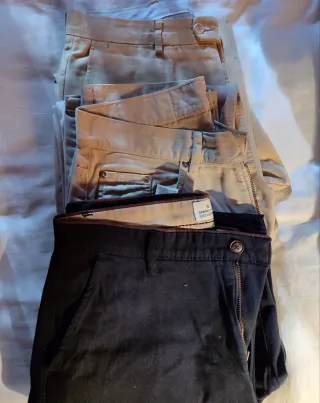Conjunto de tres pantalones para hombre en tonos beige y negro,talla 40/42,marca d Cortefiel y zara,muy buen estado,dos modelos chino y un vaquero d 4 bolsillos - Tres pantalones incluidos en el lote. - Variedad de colores para combinar,beige marino y tostado