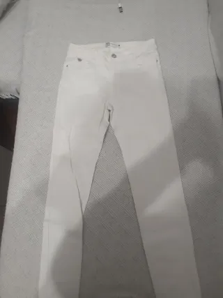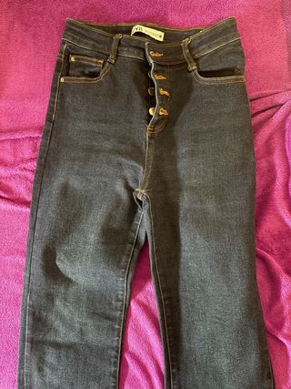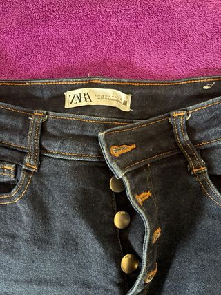 Pantalones vaqueros de tiro alto de la marca Zara. - Diseño de cinco botones en la bragueta. - Costuras en contraste. - Bolsillos delanteros y traseros.