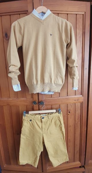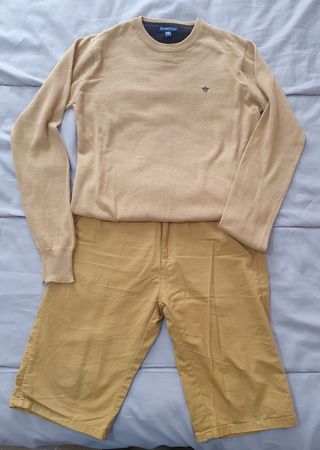 Dos pantalones talla 11/12 Dos camisas talla 12 y 14 Dos jerséis talla 14 Los pantalones son color mostaza, aunque en alguna foto se ve más beige