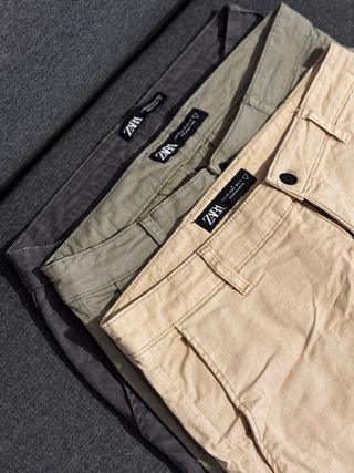 Conjunto de dos pantalones de la marca Zara. - Un pantalón de color beige. - Un pantalón de color verde oliva. - Un pantalón de color gris .